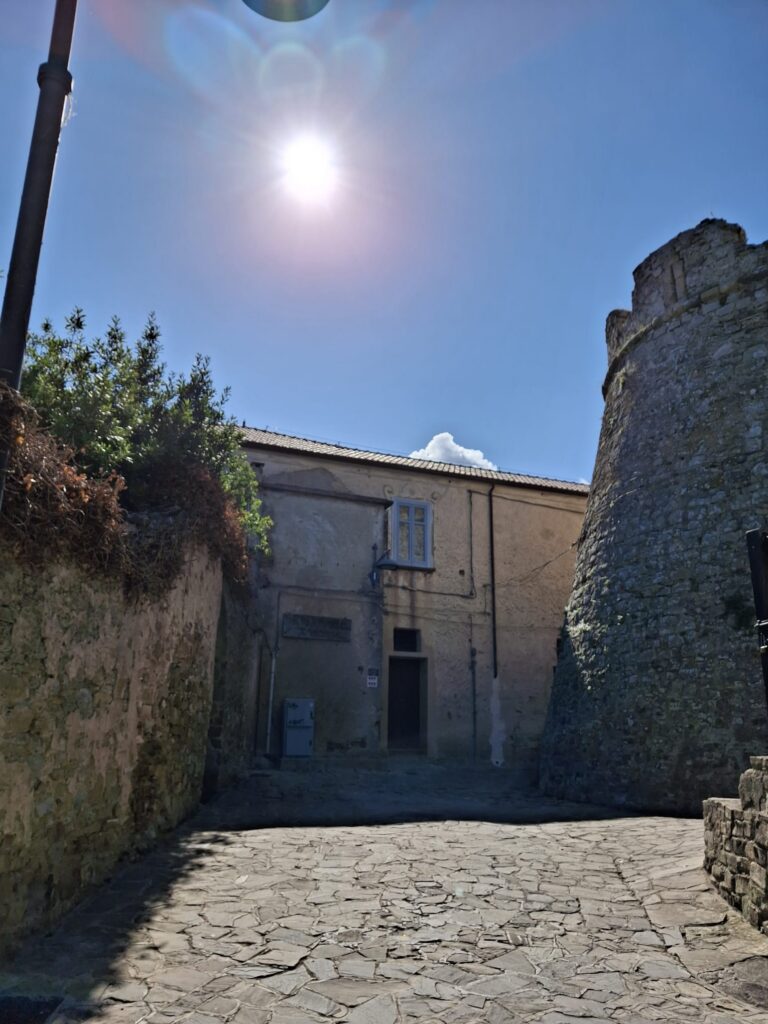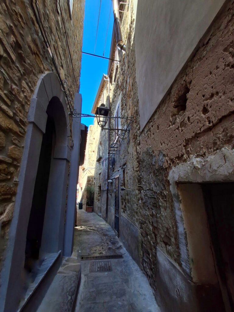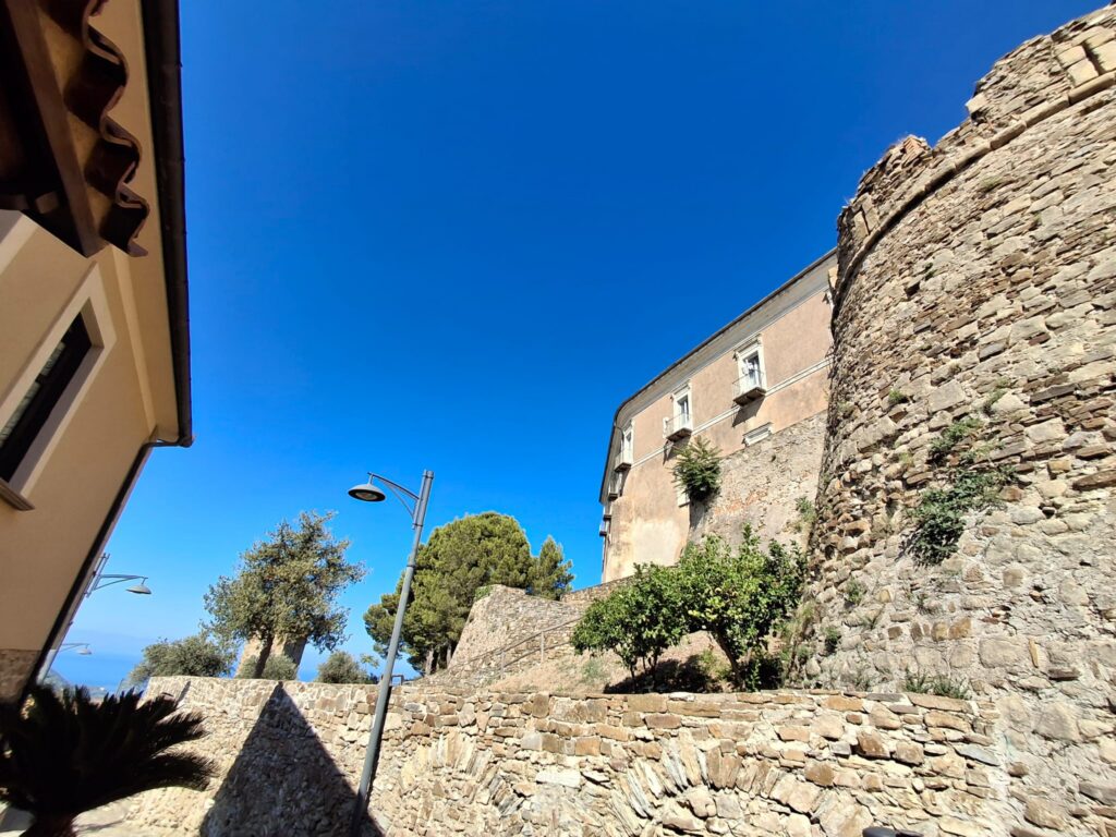 La sua struttura ricorda quella delle fortificazioni medievali con mura merlate perimetrali e quattro torri angolari. All’interno un dedalo di vie, vicoli in pietra viva e passaggi strettissimi i quali, posti al di sotto delle abitazioni, servivano per consentire la fuga della popolazione verso la zona costiera in caso di incursioni nemiche. Il panorama che si apre dal castello è qualcosa di unico e mostra tutta la bellezza dell’intero Golfo.
