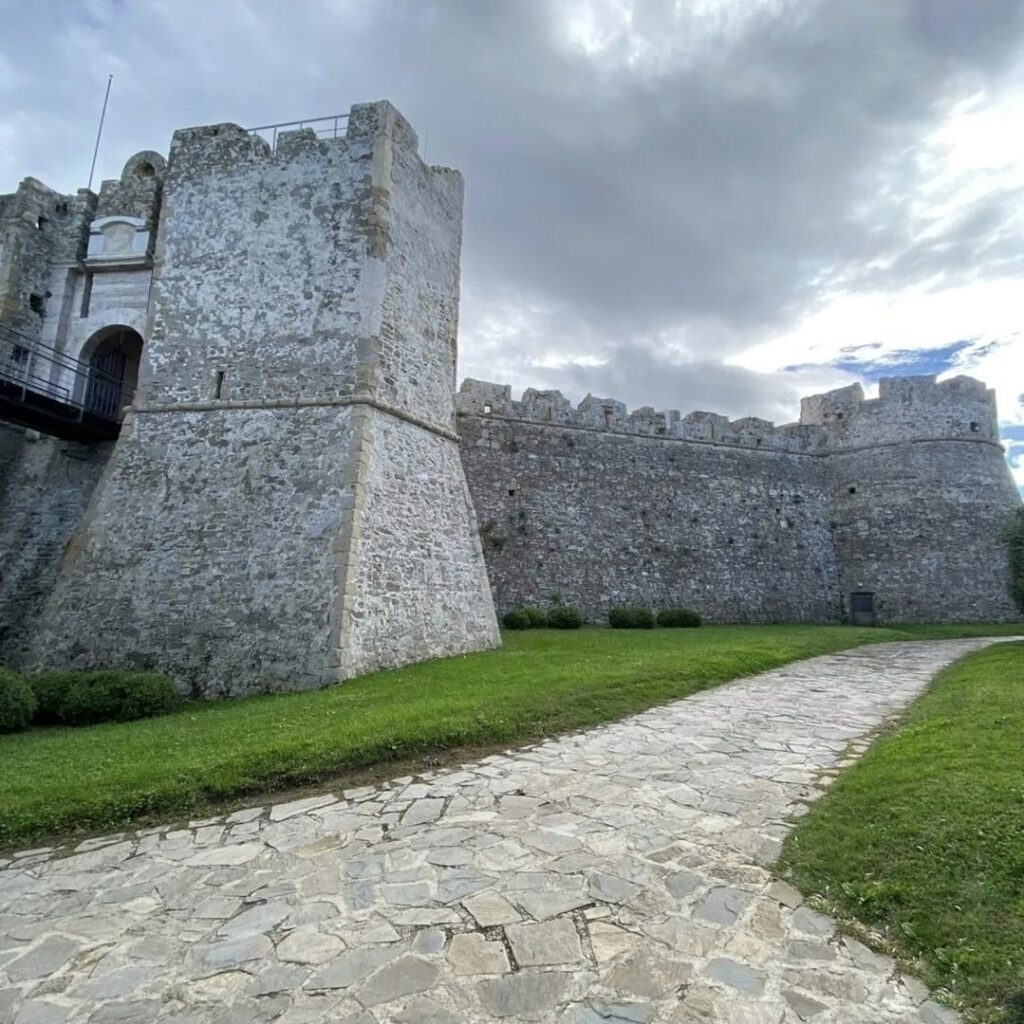 Di rilevante importanza troviamo il Castello Angioino-Aragonese posto sulla sommità del promontorio del VI secolo di origini bizantine ma poi ristrutturato dagli aragonesi nel XV secolo, costruito come punto di difesa della città e presidio nobiliare. Ha una pianta triangolare con tre torri circolari. Al suo interno possiamo osservare la piazza d’armi, ora usata come teatro all’aperto, e le antiche carceri. Visibile è ancora il fossato che ne circonda la struttura.